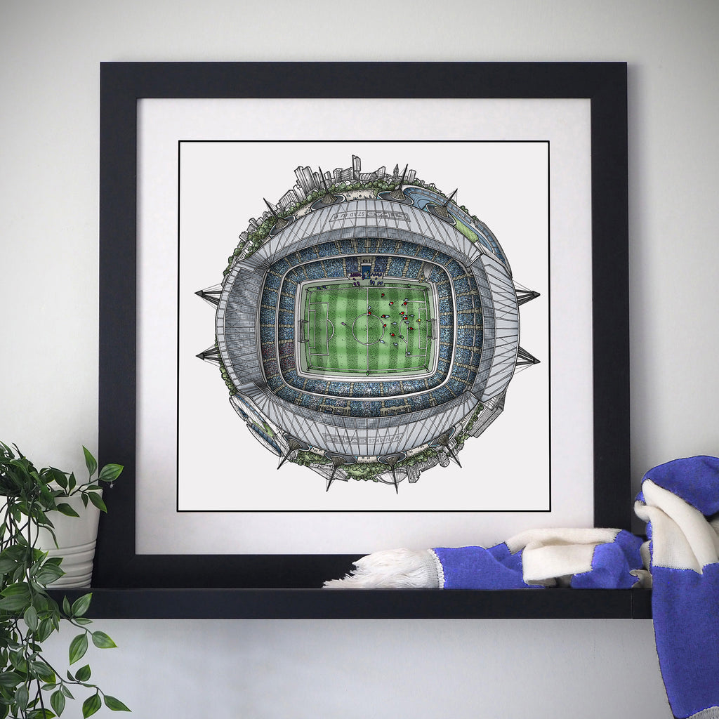 Hand drawn cityscape illustration of Manchester City's Etihad Stadium using pen and ink - updated in 2026 to include the new North Stand extension!
